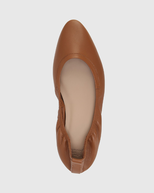 The Edgar in dark cognac leather is a flat sandal in a summer colour palette. Thick straps and an almond toe are set on top of a flat stack heel. Tan leather and gold hardware can be paired with neutral tones for day and for night.