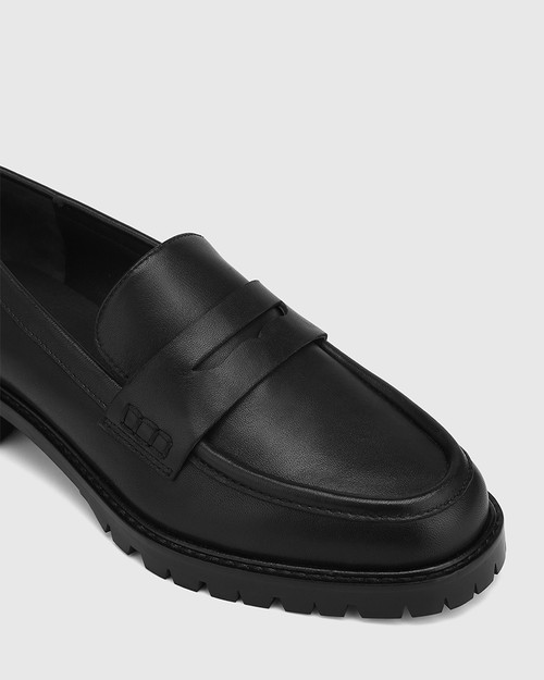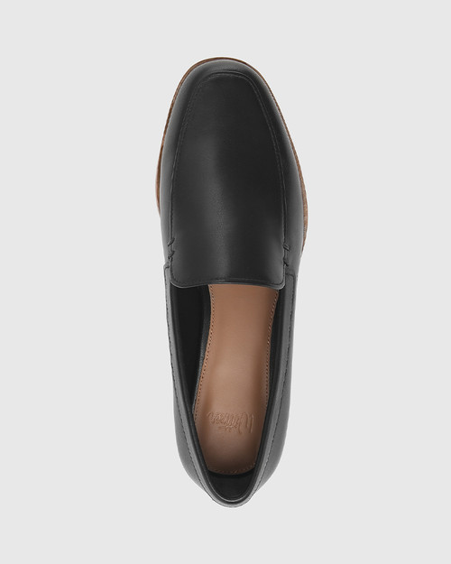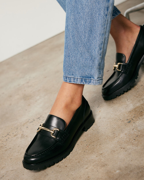 Crafted with soft black nappa leather, the Flossie loafer is a true classic. Clean lines offer a sleek silhouette, finished with a low block heel for easy all-day wear, making Flossie a versatile addition to any wardrobe.