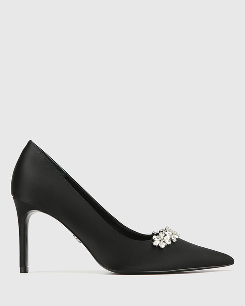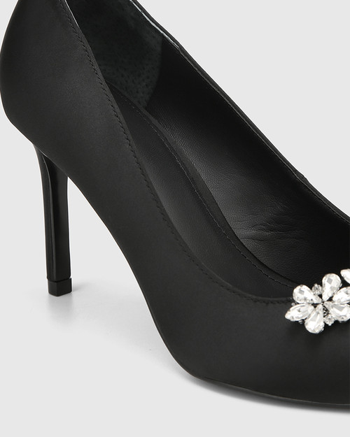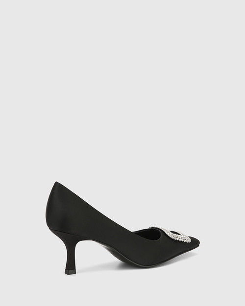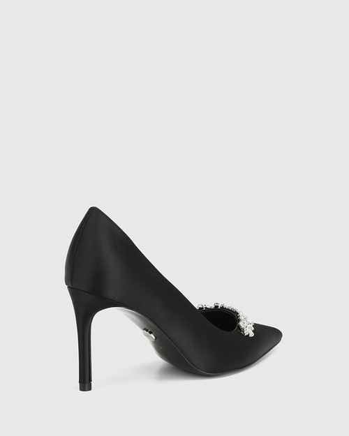 Upgrade your event-ready wardrobe with the fabulous Qiesha pump. Inspired by and designed after our most sought-after pump, this limited edition heel ups the ante with its recycled satin upper meticulously embellished in diamantes. Style yours with your event-ready wardrobe for impact upon entrance.